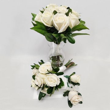 1 Bride Bouquet, 3 Bridesmaids, 2 Single Rose corsages, 8 Single Rose Boutonnieres